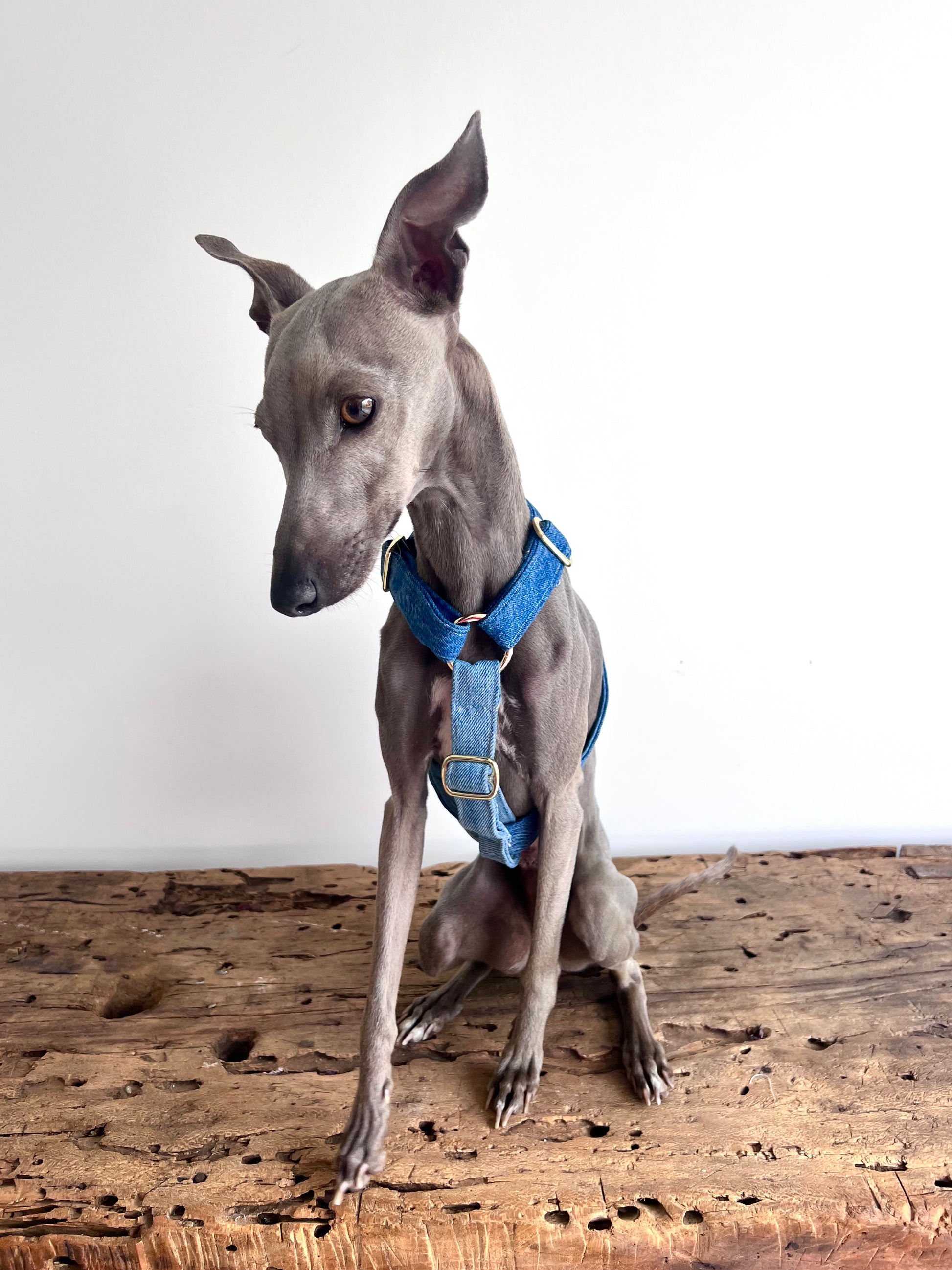 Notre Harnais pour chiens Bleu Jean est fabriqué entièrement à la main par nos soins.