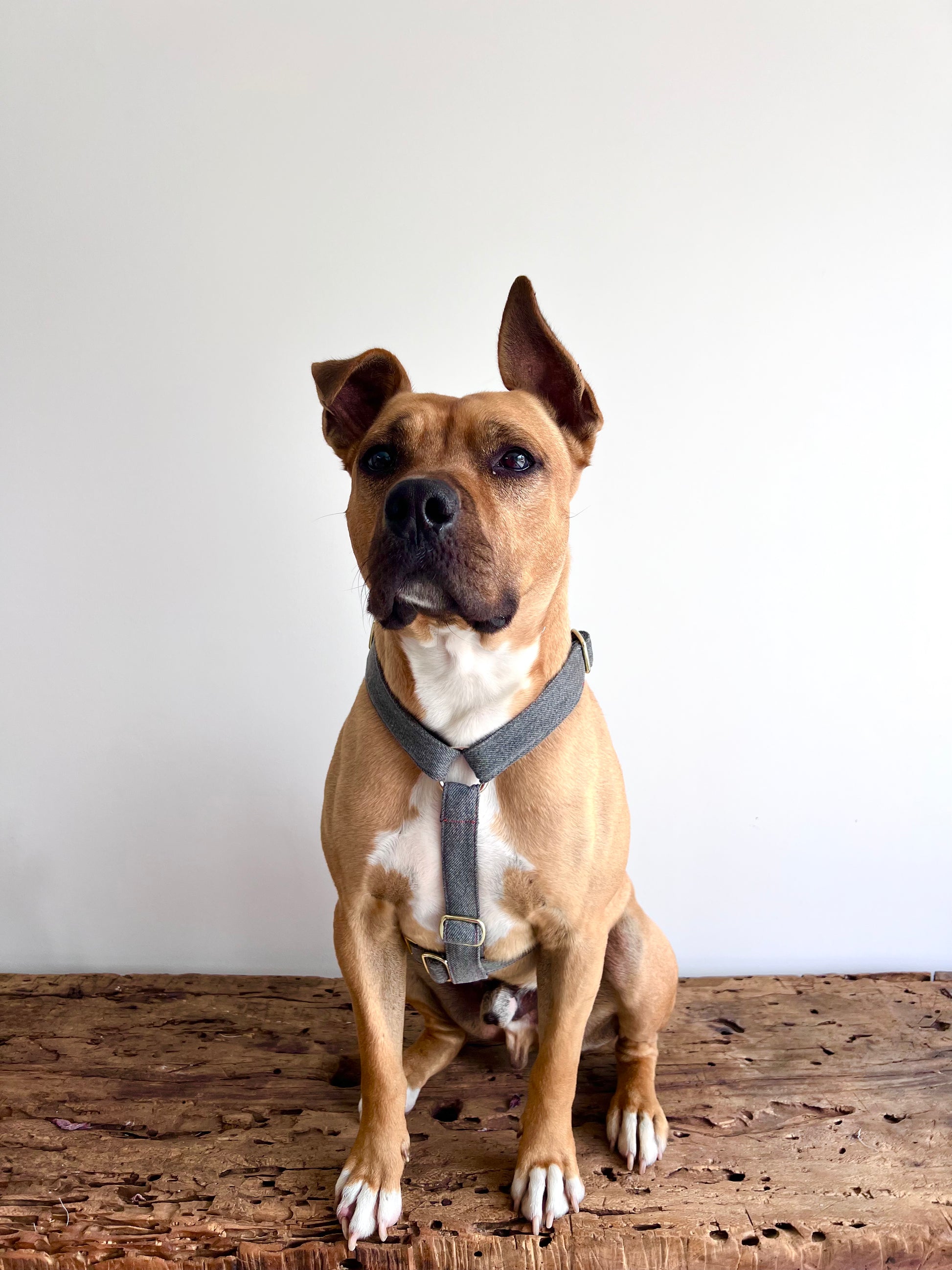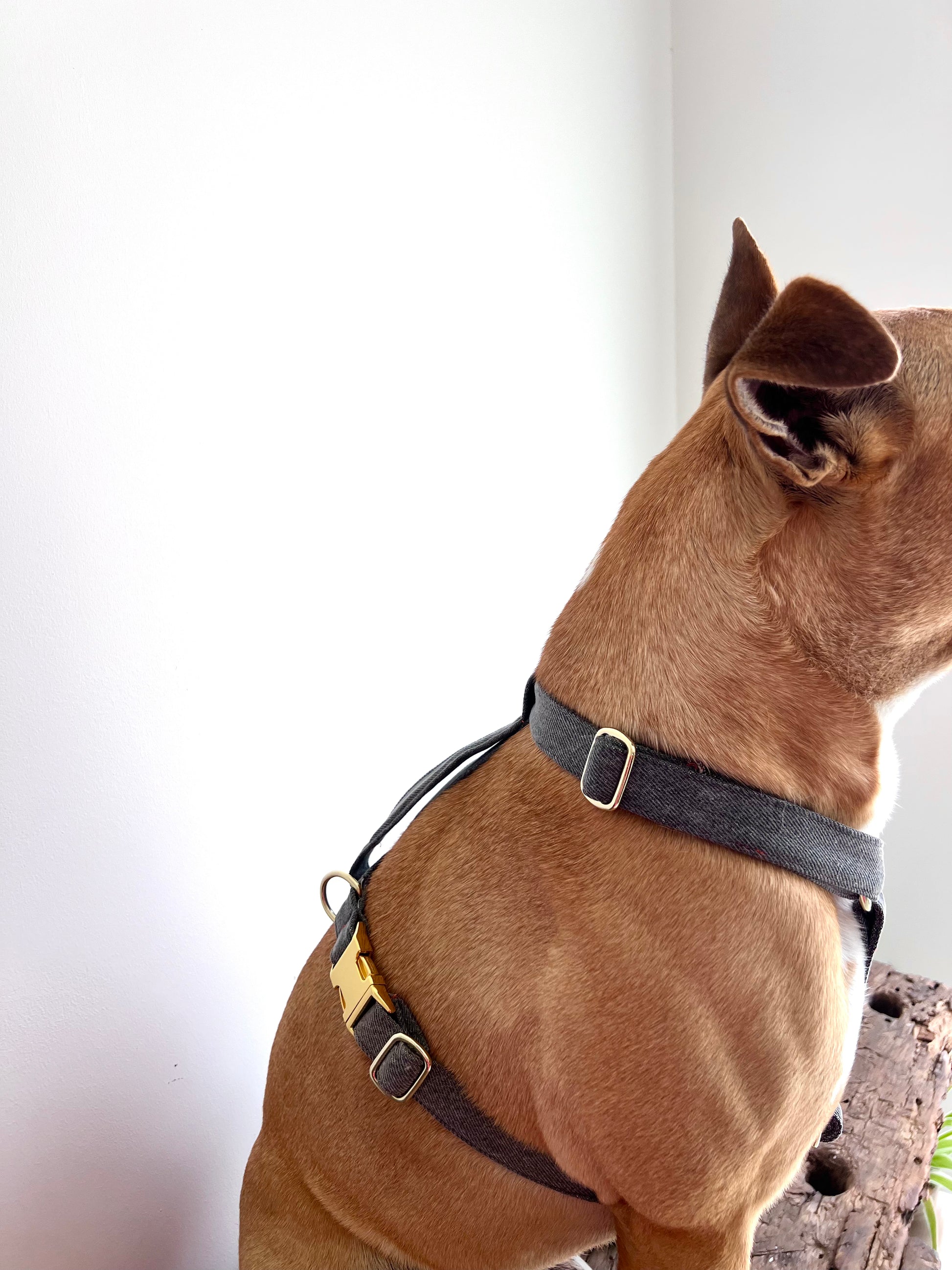 Notre Harnais pour chiens Gris Jean est fabriqué entièrement à la main par nos soins.