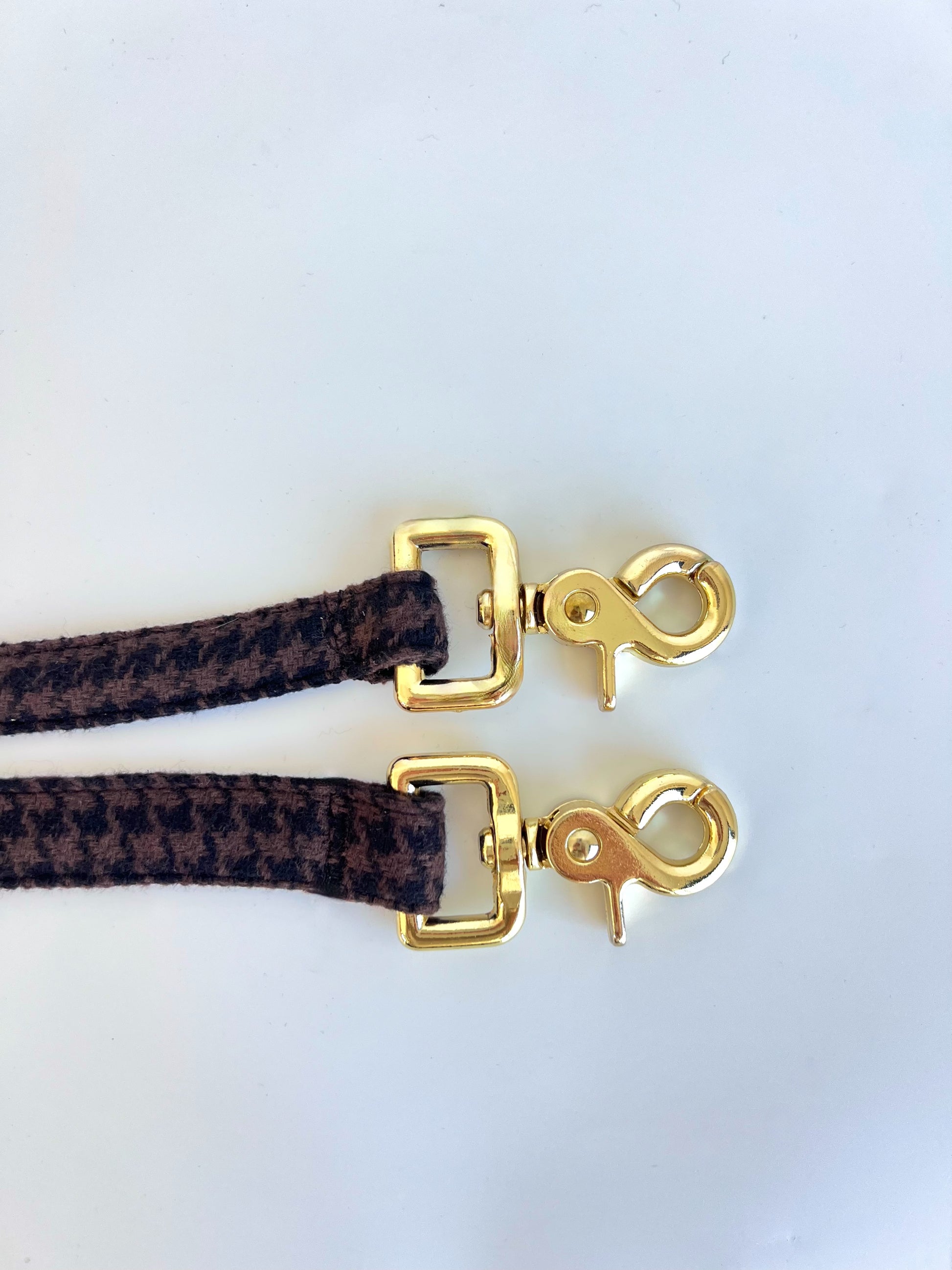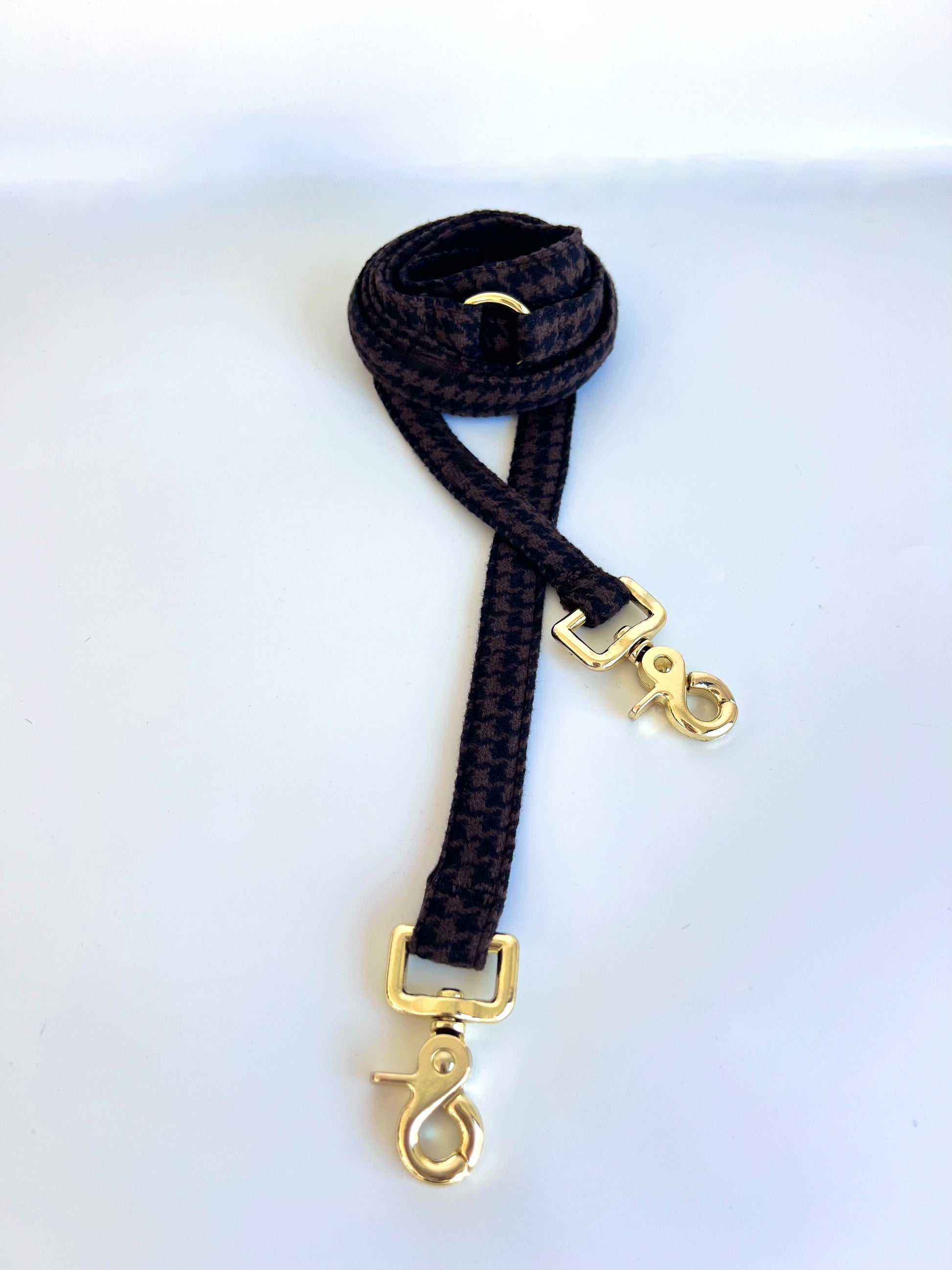 Notre laisse pour chiens Pied de poule marron est fabriquée entièrement à la main par nos soins.
