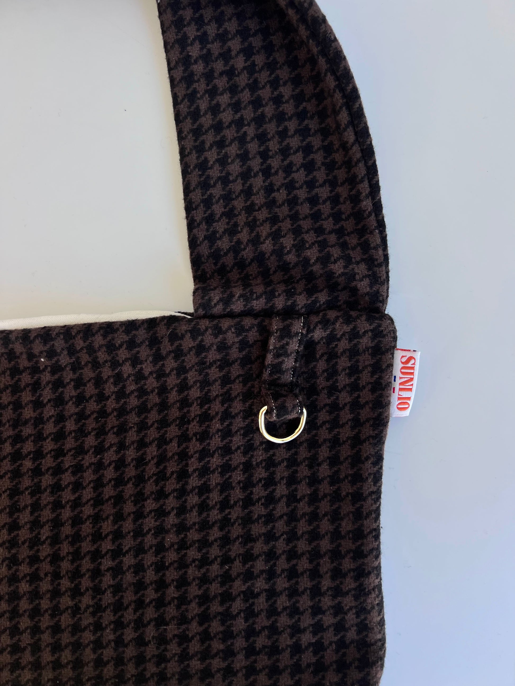 Notre sac de portage Pied de poule marron est fabriqué entièrement à la main dans notre atelier.
